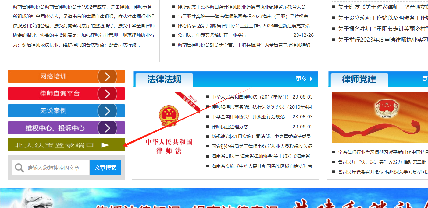 (一)請(qǐng)打開海南省律師協(xié)會(huì)官方網(wǎng)站:http://www.beiqinsg.com/,點(diǎn)擊官網(wǎng)主頁(yè)左下“北大法寶檢索數(shù)據(jù)庫(kù)”,如下圖所示: